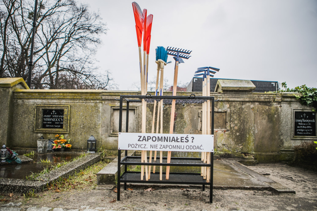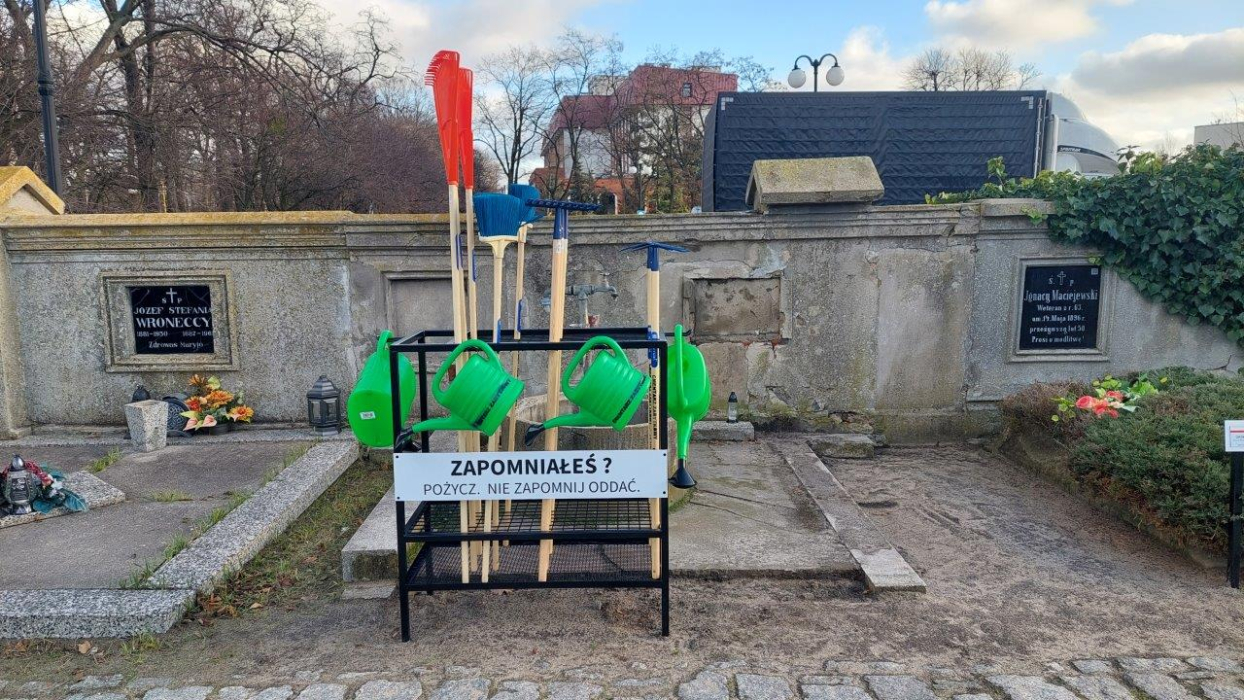 Na cmentarzu pojawiły się także specjalne stojaki na narzędzia, które są niezbędne do porządkowania i pielęgnacji nagrobków i otoczenia wokół nich. Wśród nich są grabie, konewki oraz szczotki. Każde z nich odpowiednio oznakowane. Na stojaku zamontowano napis: Zapomniałeś? Pożycz. Nie zapomnij oddać.
