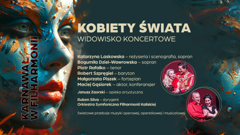 Koncert duetu doskonałych wokalistów będzie też odpowiednim wstępem do tego, aby wybrać się na drugie z karnawałowych wydarzeń w Filharmonii Kaliskiej – widowisko koncertowe Kobiety Świata, które przygotowali autorzy projektu OperaLight pod artystyczną opieką świetnie znanego reżysera Janusza Zaorskiego. Ten spektakl to prawdziwe muzyczno-aktorskie show, które łączy w sobie dwa pozornie odległe bieguny: muzykę klasyczną oraz rozrywkową. Projekt OperaLight, prezentuje utwory klasyki wokalnej: światowe przeboje muzyki operowej, operetkowej i musicalowej w wersji na dwa soprany: Bogumiła Dziel-Wawrowska oraz Katarzyna Laskowska (która odpowiada również za reżyserię i scenografię widowiska), solistki śpiewające na wielu scenach w kraju i za granicą oraz dwa głosy męskie - Piotr Rafałko oraz Robert Szpręgiel, soliści Polskiej Opery Królewskiej. W spektaklu zobaczymy symbole kobiecości m.in. z Polski, Niemiec, Hiszpanii, Ameryki i innych krajów, uosabiające charakterystyczne cechy narodowe podkreślone także wyborem repertuaru. Własne, niepowtarzalne aranżacje, podane z dużą dawką humoru, gra aktorska oraz oprawa kostiumowa zapowiadają doskonałą rozrywkę dla melomanów, których z pewnością oczaruje także prowadzący całość z właściwą dla siebie swadą Maciej Gąsiorek, znany i lubiany aktor teatralny i filmowy. Orkiestrę Symfoniczną Filharmonii Kaliskiej usłyszymy tym razem pod batutą dyrektora FK - Rubena Silvy.
