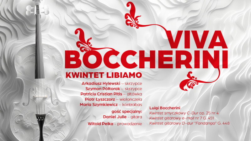 Program koncertu kameralnego VIVA BOCCHERINI został oparty właśnie na kwintetach – usłyszymy jedne z najsłynniejszych utworów artysty – przesiąknięte hiszpańskim stylem Fandango, czyli Kwintet gitarowy D-dur G. 448; Kwintet gitarowy e-moll nr 7 G. 451 oraz Kwintet smyczkowy C-Dur op. 25 nr 4. Przepełnione melodyczną słodyczą dzieła Boccheriniego zaprezentuje Kwintet smyczkowy LIBIAMO – jeden najlepiej znanych i doskonale przyjmowanych przez publiczność zespołów kameralnych Filharmonii Kaliskiej.