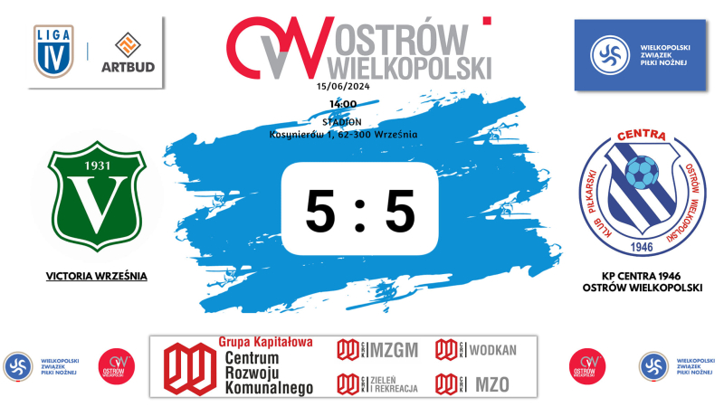 Ostrowianie bardzo dobrze rozpoczęli mecz we Wrześni i po niewiele ponad pół godzinie prowadzili 2:0 po trafieniach Jakuba Józefiaka i Jakuba Sobczaka. Gol do szatni zdobyty przez gospodarzy popsuł nieco humory ostrowian, ale przede wszystkim dodał animuszu wrześnianom, którzy po przerwie przypuścili prawdziwy szturm na ostrowską bramkę. Między 52 a 67 minutą Victoria zdobyła trzy gole i z wyniku 2:0 dla Centry zrobiło się 2:4. O ile wyczyn gospodarzy był imponujący to to co pokazał w kolejnych minutach Michał Kucharski. Ostrowianin w niespełna kwadrans zdobył klasycznego hat-tricka wyprowadzając Centrę na prowadzenie 5:4. Wydawało się, że po takim wstrząsie gospodarze się już nie pozbierają, tymczzasem w 89 minucie udało im się przerpowadzić akcję, która dała im wyrównanie i ustaliła wynik meczu na 5:5.