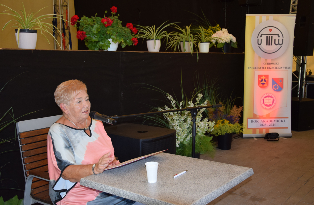 Na wstępie prezes Aleksandra Biegańska przekazała Słuchaczkom i Słuchaczom ostrowskiego uniwersytetu oraz jego wykładowcom, absolwentom i przyjaciołom serdeczne pozdrowienia, dziękując za owocną współpracę i zaangażowanie na rzecz społeczności akademickiej. Powitała wielu znamienitych gości, a wśród nich Radosława Torzyńskiego - Wicestarostę Ostrowskiego, Dorotę Zmyśloną, dyrektor Wydziału Kultury, Kultury Fizycznej i Sportu Urzędu Miasta, Józefa Kozana, założyciela OUTW i jej Honorowego Prezesa, dr Bognę Skrzypczak-Walkowiak – kierownika Mediateki a jednocześnie członka Rady Programowej OUTW.