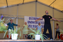 Ich uzupełnieniem był pokaz zajęć mikro sekcji TAI CHI prowadzonych przez Adama Jakubka, zajęć polegających na sztuce panowania nad swoim ciałem i umysłem. Opiekun grupy wraz z kilkoma seniorkami zaprezentował na scenie, na czym polegają ćwiczenia łączenia oddechu z ruchem. Ten pokaz wzbudził entuzjazm widowni do tego stopnia, że wszyscy włączyli się aktywnie do tych ćwiczeń. Owacjom na stojąco nie było końca. Wielu seniorów wyraziło chęć uczestnictwa w takich zajęciach w nowym roku akademickim.