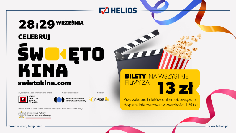 Podczas najbliższego weekendu 28 i 29 września widzowie kin ogólnopolskiej sieci Helios będą mieli okazję uczestniczyć w wyjątkowym wydarzeniu – już po raz kolejny odbędzie się wielkie „Święto Kina”. Najważniejszym celem akcji jest popularyzowanie kinematografii, kultury chodzenia do kina oraz oglądanie filmów na dużym ekranie.