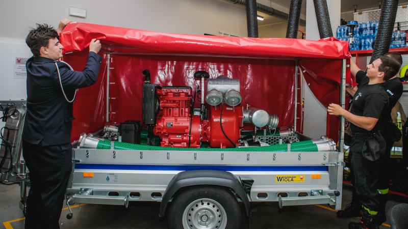 Motopompa do zanieczyszczonej wody wraz z przyczepą uzupełniła sprzęt strażaków ochotników przy ulicy Staszica. Długi czas pracy, szybkie uruchamianie, łatwa obsługa… strażacy wymieniają same plusy nowego sprzętu.