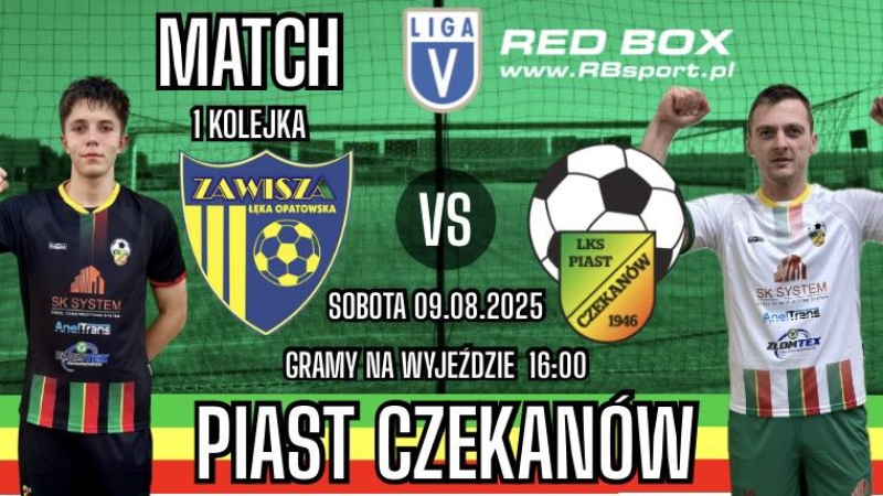 W pierwszej kolejce Piast udał się do Łęki Opatowskiej na mecz z sąsiadem z tabeli z poprzedniego sezonu - Zawiszą. Gospodarze przystąpili do meczu z dużym animuszem i już w 2 minucie objęli prowadzenie. Czekanowianie potrzebowali nieco czasu by wejść w mecz, z czasem gra się wyrównała i choć gospodarze nadal groźnie atakowali to gola po podaniu Ariela Lesienia zdobył Tomasz Graczyk doprowadzając do remisu.