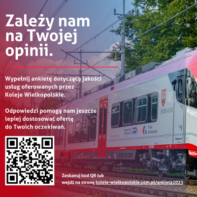 W okresie od 13 do 26 listopada Koleje Wielkopolskie realizują wśród pasażerów badania jakości świadczonych usług. Kwestionariusz z pytaniami dostępny jest online, co oznacza, że można go wypełnić w dowolnym czasie i z dowolnego urządzenia z dostępem do Internetu. Badania są całkowicie anonimowe, a samo wypełnienie ankiety zajmuje kilka minut.