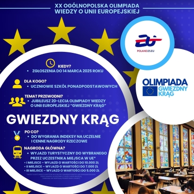 EUROPE DIRECT Ostrów Wielkopolski zaprasza uczniów szkół ponadpodstawowych do udziału w XX jubileuszowej edycji OLIMPIADY WIEDZY O UNII EUROPEJSKIEJ GWIEZDNY KRĄG.