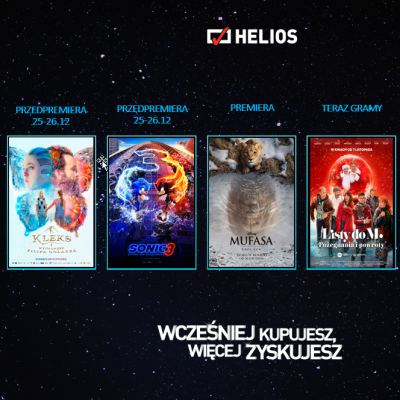 Magiczna atmosfera Świąt zawitała do kin, w których obok gwiazdkowych tytułów zagoszczą porywające nowości. W repertuarze znajdzie się premiera – „Mufasa: Król Lew”, jak również seanse przedpremierowe wyczekiwanych produkcji: „Kleks i Wynalazek Filipa Golarza” oraz „Sonic 3. Szybki jak błyskawica”. Muzyczne emocje zapewni projekcja świątecznego koncertu André Rieu.