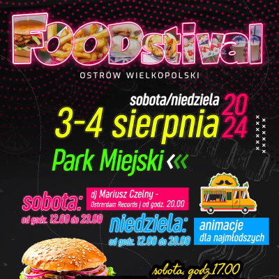 Zapraszamy na FOODstival w Parku Miejskim w weekend 3 i 4 sierpnia. Przygotujcie się na niezapomnianą ucztę smaków z całego świata. Sobotni wieczór wypełnimy muzyką, a niedzielne popołudnie - zabawami dla najmłodszych.