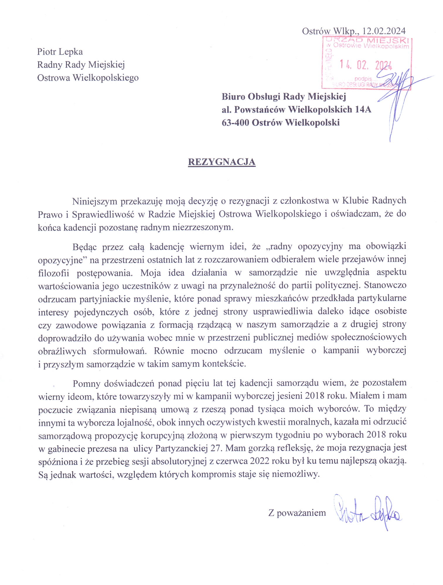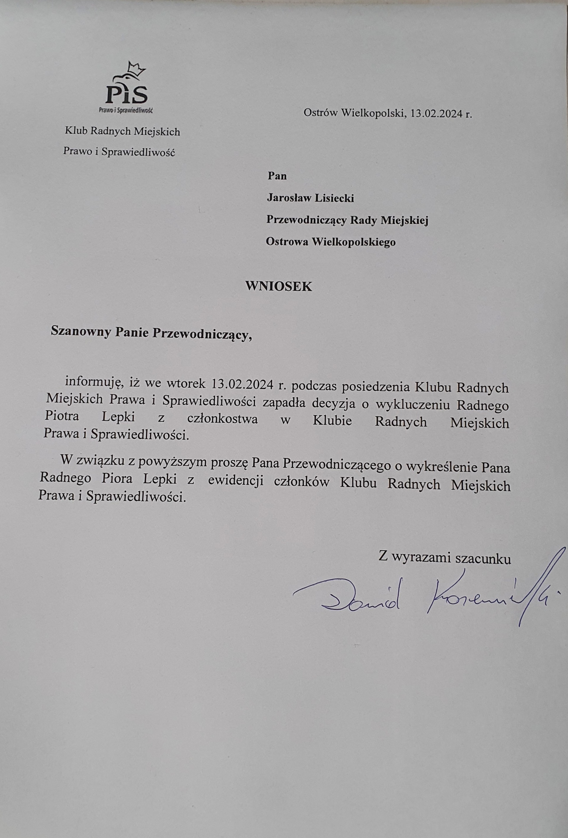 W piśmie datowanym na 12 lutego, a złożonym w biurze Rady Miejskiej 14 lutego radny Piotr Lepka informuje, że rezygnuje z członkostwa w Klubie Radnych PiS i oświadcza, że „do końca kadencji pozostanie radnym niezależnym”. Z kolei przewodniczący Dawid Korzeniewski w piśmie datowanym na 13 lutego (brak daty wpływu do biura Rady Miejskiej) a przesłanym do mediów 14 lutego informuje, że „podczas posiedzenia Klub Radnych Miejskich PiS zapadła decyzja o wykluczeniu radnego z członkostwa w klubie”.
